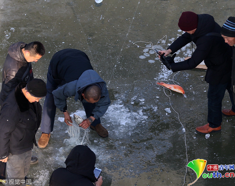 2018年11月25日,黑龍江省哈爾濱市,松花江封江不久,已經(jīng)有人蹬江鑿冰下網(wǎng)捕魚。 圖片來(lái)源:視覺(jué)中國(guó)