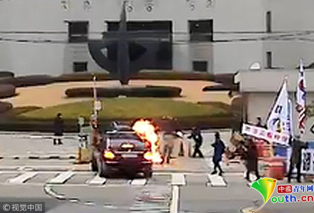 當(dāng)?shù)貢r(shí)間2018年11月27日,韓國首爾,27日上午9點(diǎn)10分,在首爾瑞草區(qū)的最高法院前面,一名74歲的示威男子向韓國最高法院院長金明秀所乘的車輛投擲燃燒瓶。副駕駛一側(cè)的前輪和示威男子身上均起火,所幸被現(xiàn)場警察迅速撲滅,金明秀未受傷。當(dāng)時(shí),他正準(zhǔn)備去上班。