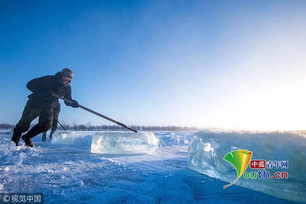 當(dāng)?shù)貢r(shí)間2018年11月27日,雅庫茨克,零下41攝氏度左右的氣溫下,村民在當(dāng)?shù)氐囊粋€(gè)湖中采集冰塊。當(dāng)?shù)睾芏嗳艘蕾囉谌诨鶋K解決供水,因?yàn)槎嗄陜鐾粮采w地區(qū)冬季氣溫極低,沒有其他的方式供應(yīng)水。