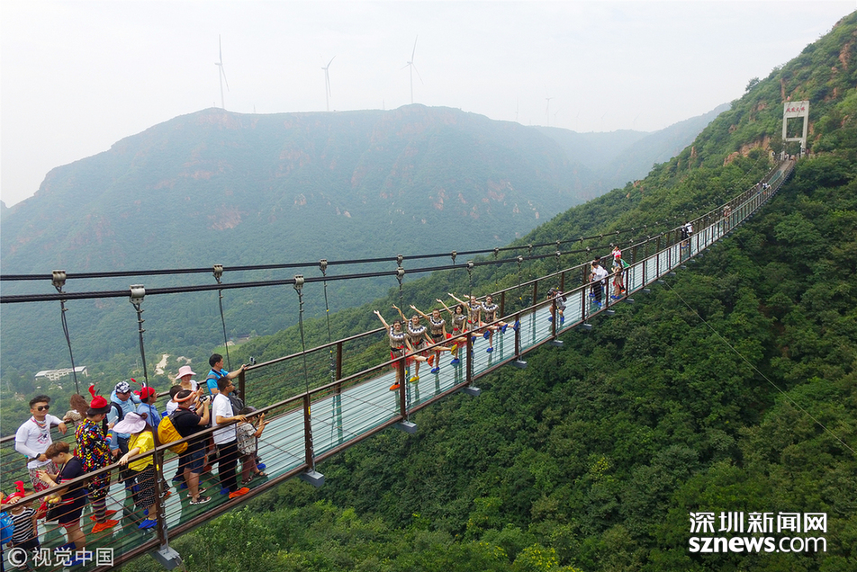 2018年6月30日,鄭州新密一景區(qū)的玻璃吊橋上,幾名美女大學(xué)生身穿“野人”服裝練習(xí)瑜伽,吸引了眾多游客的圍觀。據(jù)了解,這些大學(xué)生來(lái)自鄭州。