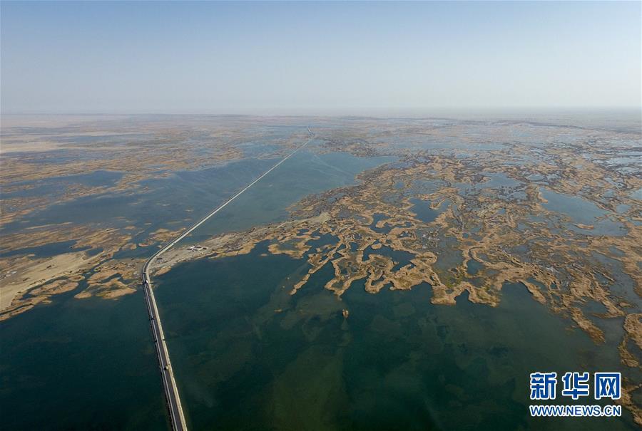 218國(guó)道在塔里木河尾閭——臺(tái)特瑪湖中間延伸(2017年10月22日無(wú)人機(jī)拍攝)。 新華社記者 趙戈 攝