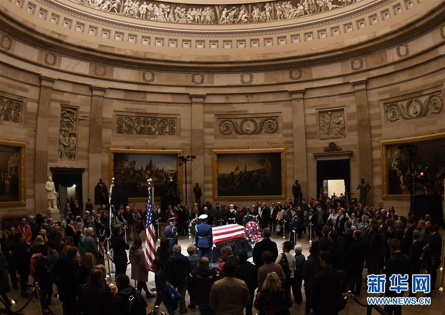 美國前總統(tǒng)老布什的遺體3日下午運抵首都華盛頓,安放在國會大廈圓頂大廳,接受吊唁。