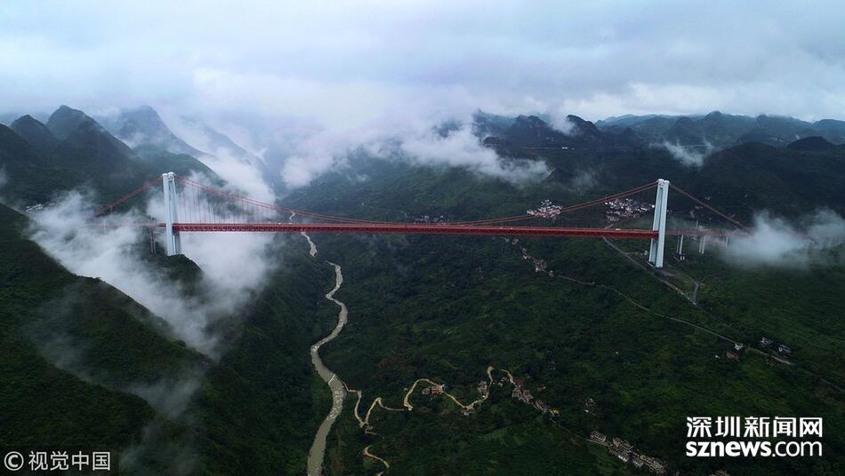 2018年6月26日,一場大雨后貴州省安順市關(guān)嶺縣壩陵河大峽谷云霧繚繞,橫跨兩岸的壩陵河大橋在云霧中時隱時現(xiàn),更顯雄偉壯觀。