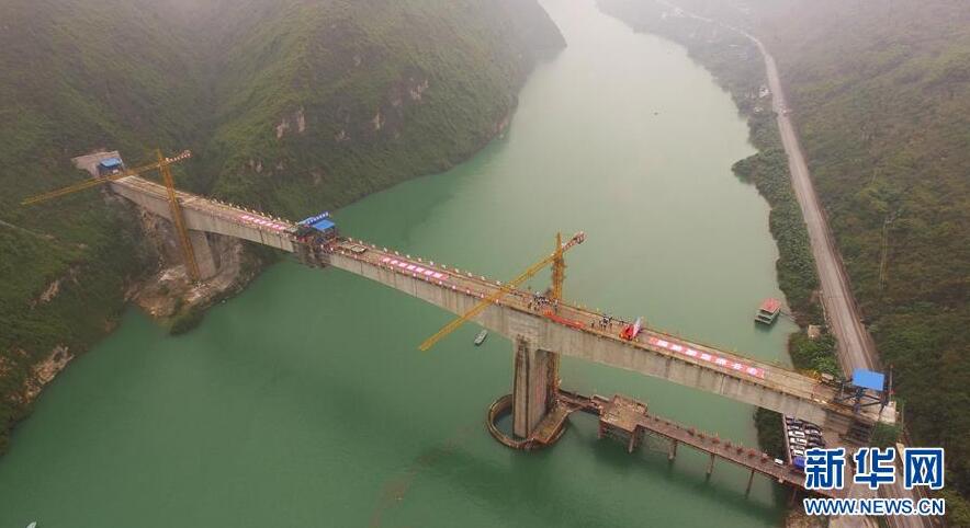 在重慶涪陵拍攝的渝懷鐵路涪秀二線重點(diǎn)工程——烏江右線大橋(10月23日無人機(jī)拍攝)。10月23日,由中鐵四局承建的渝懷鐵路涪秀二線重點(diǎn)工程——烏江右線大橋主跨成功合龍,標(biāo)志著大橋主體工程全部順利結(jié)束。烏江右線大橋項(xiàng)目全程460.1米,主跨192米,跨越烏江和319國道。在兩年多的建設(shè)過程中,施工人員攻克了“不等高墩”“不對稱邊跨”“邊跨入隧”等多個(gè)技術(shù)難題。新華社記者王全超攝