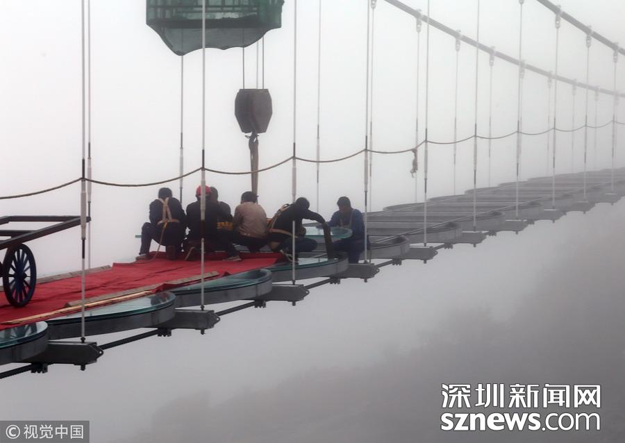 深圳新聞網(wǎng)訊 2018年12月3日,在浙江玉環(huán)市上棧頭玻璃吊橋建設(shè)工地上,工人們正在北端橋頭鋪設(shè)橋面4厘米厚的玻璃,預(yù)計46個箱梁的玻璃全部鋪設(shè)完成需到5日,然后再進入安裝兩側(cè)護欄和拉攀抗風(fēng)拉索,吊橋工程竣工定于23日,準(zhǔn)備在2019年元旦試運行。
