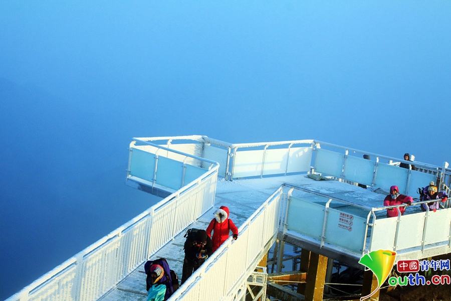 上到金子山最高峰可以看到,玻璃天梯像一條巨龍,沿著金子山最高峰山腰蜿蜒而上,每一個(gè)階梯都是玻璃做的,頂上是藍(lán)天白云,四周是莽莽群山,天梯下面是深不可測(cè)的懸崖絕壁。