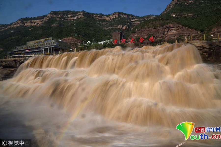 5月31日,山西臨汾奔騰咆哮的黃河壺口瀑布吸引游客。近日,受上游地區(qū)降雨量增多影響,黃河干流晉陜峽谷水量大增,每秒流量達到1100立方,是常年同期的三倍,壺口瀑布出現五月份罕見的瀑布群景觀,吸引了眾多游客。圖片來源:視覺中國