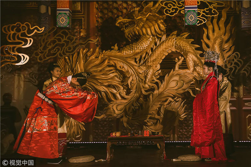 但最吸引參加婚禮的親朋好友眼球的,是整個婚禮現(xiàn)場富麗堂皇如皇宮一般。龍鳳呈祥,仿佛置身于古時皇宮大殿。圖為婚禮現(xiàn)場,具有古典風(fēng)味的合影。