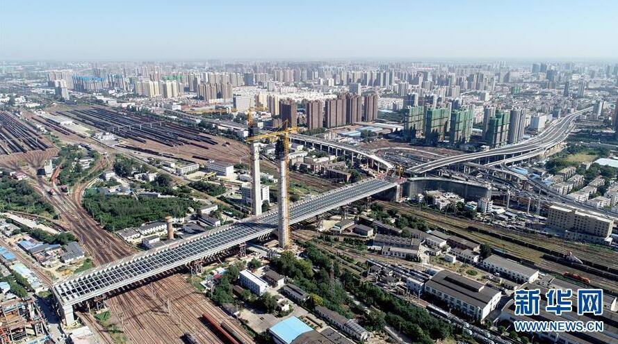 9月7日無(wú)人機(jī)拍攝的鄭北大橋鋼梁頂推施工現(xiàn)場(chǎng)。當(dāng)日,跨越鄭州北站的鄭北大橋鋼梁頂推成功。鄭北大橋是東西走向的鄭州市農(nóng)業(yè)路快速通道工程的一部分,需跨越鄭州北站。由于列車不能中斷運(yùn)行,鄭北大橋不能采用常見(jiàn)的搭腳手架方式施工,而是采用頂推法,即在大橋一端把橋身拼接好,然后一段一段朝著鐵路編組站上方送過(guò)去,最終完成橋梁架設(shè)。新華社記者朱祥攝