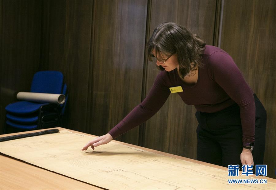 11月2日,在英國紐卡斯?fàn)柕奶┒鳌枡n案館,檔案管理員瑞秋·吉爾介紹致遠(yuǎn)艦設(shè)計(jì)圖紙。 新華社記者日前在紐卡斯?fàn)柼┒鳌枡n案館查找北洋海軍史料時(shí)發(fā)現(xiàn)一套七張、檔案名為“中國巡洋艦舵機(jī)設(shè)計(jì)圖”的原始圖紙。塵封百年,甲午海戰(zhàn)中抗擊日艦后沉沒的清北洋海軍致遠(yuǎn)艦部分原廠設(shè)計(jì)圖紙?jiān)谄浣ㄔ斓亍~卡斯?fàn)柺械囊患覚n案館首次被發(fā)現(xiàn),為打撈那段悲壯的歷史提供了重要參考。 新華社記者 韓巖 攝
