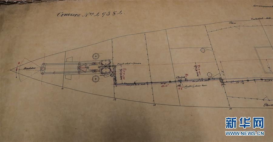 這是11月2日在英國紐卡斯?fàn)柕奶┒鳌枡n案館拍攝的致遠(yuǎn)艦設(shè)計圖紙。 新華社記者日前在紐卡斯?fàn)柼┒鳌枡n案館查找北洋海軍史料時發(fā)現(xiàn)一套七張、檔案名為“中國巡洋艦舵機設(shè)計圖”的原始圖紙。塵封百年,甲午海戰(zhàn)中抗擊日艦后沉沒的清北洋海軍致遠(yuǎn)艦部分原廠設(shè)計圖紙在其建造地——英國紐卡斯?fàn)柺械囊患覚n案館首次被發(fā)現(xiàn),為打撈那段悲壯的歷史提供了重要參考。 新華社記者 韓巖 攝