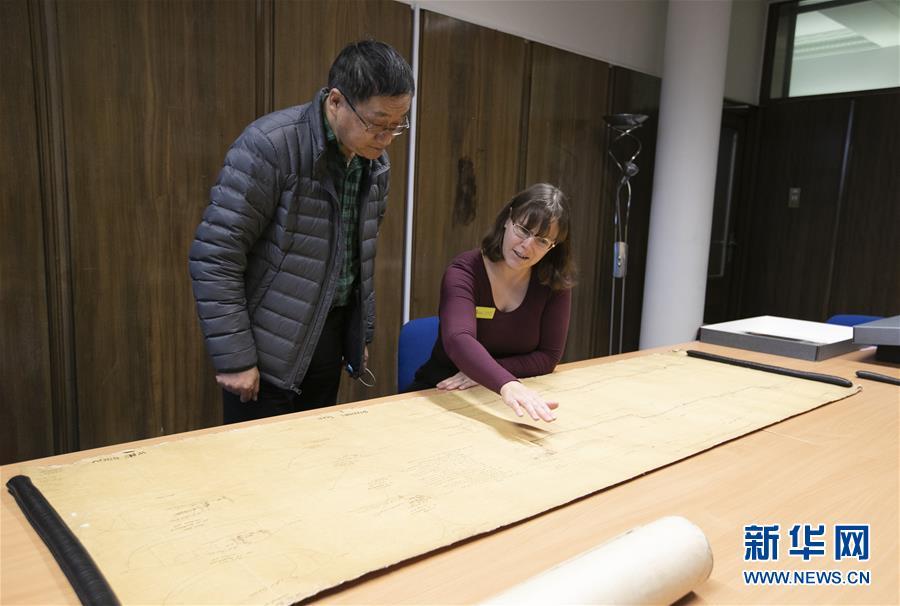 11月2日,在英國紐卡斯?fàn)柕奶┒鳌枡n案館,檔案管理員瑞秋·吉爾(右)向新華社記者介紹致遠(yuǎn)艦設(shè)計(jì)圖紙。 新華社記者日前在紐卡斯?fàn)柼┒鳌枡n案館查找北洋海軍史料時(shí)發(fā)現(xiàn)一套七張、檔案名為“中國巡洋艦舵機(jī)設(shè)計(jì)圖”的原始圖紙。塵封百年,甲午海戰(zhàn)中抗擊日艦后沉沒的清北洋海軍致遠(yuǎn)艦部分原廠設(shè)計(jì)圖紙?jiān)谄浣ㄔ斓亍~卡斯?fàn)柺械囊患覚n案館首次被發(fā)現(xiàn),為打撈那段悲壯的歷史提供了重要參考。 新華社記者 韓巖 攝
