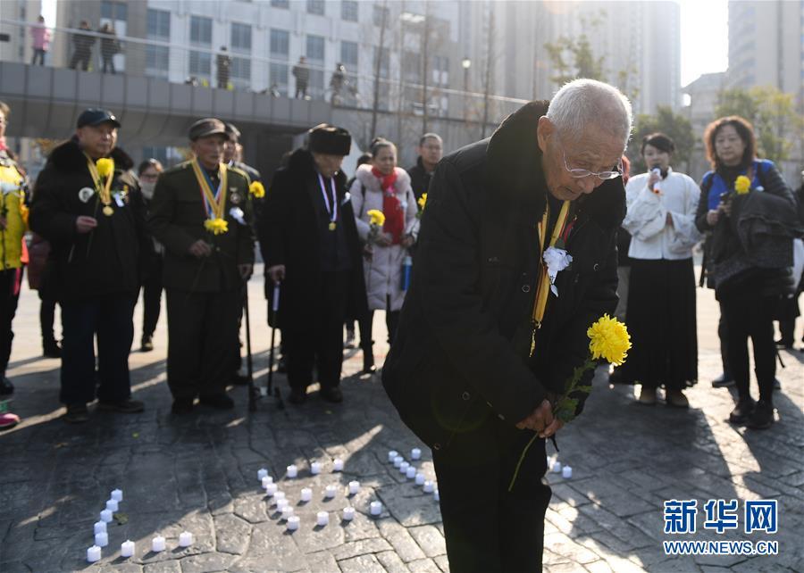 12月12日,來自湖南的抗戰(zhàn)老兵李湘炳(前)等在侵華日軍南京大屠殺中山碼頭遇難同胞紀(jì)念碑前祭奠遇難同胞。 當(dāng)日,來自湖南、江蘇等地的4名抗戰(zhàn)老兵以及志愿者、南京當(dāng)?shù)卮髮W(xué)生代表等來到侵華日軍南京大屠殺中山碼頭遇難同胞紀(jì)念碑前獻(xiàn)花、默哀,祭奠遇難同胞。 新華社記者 季春鵬 攝