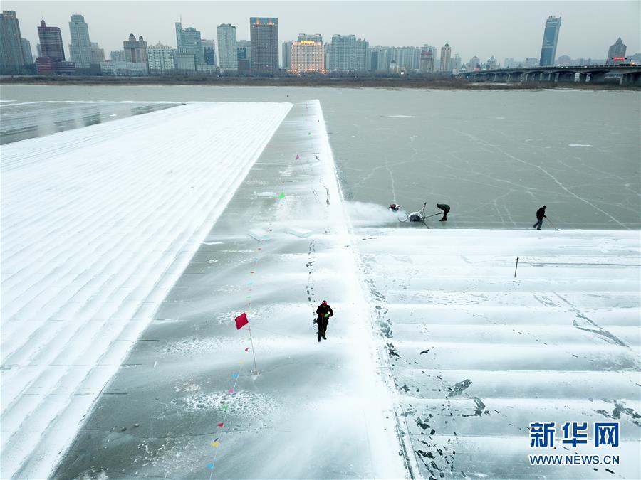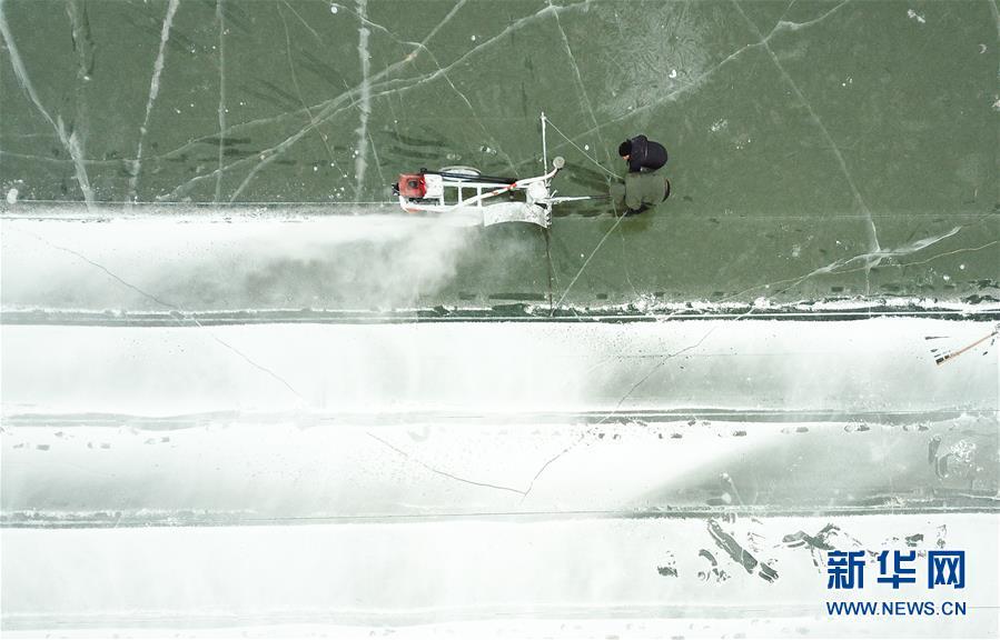 在松花江哈爾濱段江面,工人們?cè)谶M(jìn)行切割和采冰工作(12月12日無人機(jī)拍攝)。 黑龍江哈爾濱市的冰雪主題樂園哈爾濱冰雪大世界的采冰和建設(shè)工作近日拉開帷幕。為保證足夠的優(yōu)質(zhì)冰供給,每天有近千名采冰人和700多輛運(yùn)冰車參與到采冰工作。 新華社記者 王松 攝