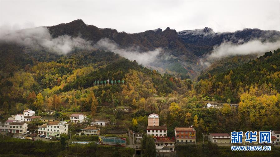 11月5日無人機拍攝的陜西省漢中市佛坪縣城旁的秦嶺景色。 新華社記者陶明攝