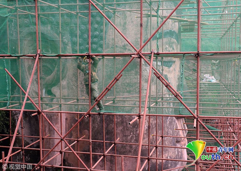 12月10日前后已逐步遮蔽大佛頭部,對頭面部進(jìn)行勘測;12月底將開始拆除頭部腳手架,保證2019年元旦節(jié)之前,先露出佛頭,供游客觀賞。