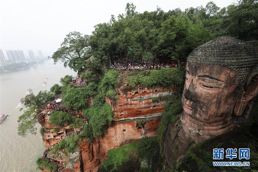 10月4日,游客在樂山大佛景區(qū)的棧道上有序排隊,一睹大佛真容?!⌒氯A社記者 江宏景 攝