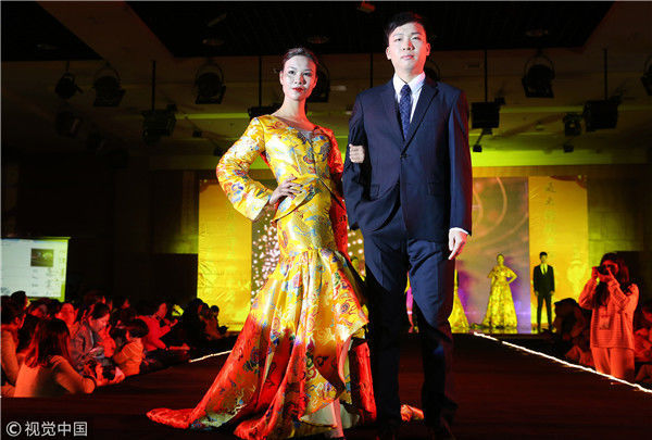 2018年12月17日晚,江蘇南通大學(xué)紡織服裝學(xué)院慶祝改革開放40周年首屆非專業(yè)新生服飾秀精彩上演,41位模特身著極具年代感的服裝,展示了55套穿搭造型,演繹了40年來不同年代的衣著風采。許叢軍/視覺中國