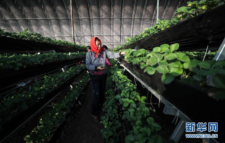 12月19日,農(nóng)戶在大棚里管理草莓。 2017年5月,遼寧省鐵嶺市昌圖縣大四家子鎮(zhèn)方家船口村利用土地確權(quán)成果,由村兩委班子成員領(lǐng)辦創(chuàng)辦了昌圖久晟果木蔬菜種植專業(yè)合作社。到2018年9月,合作社利用產(chǎn)業(yè)扶貧資金、壯大村集體經(jīng)濟扶持資金、村集體用地和村民入股資金建成了11個“股份制大棚”,主要種植草莓等作物,產(chǎn)品通過電商銷往云南、四川、北京、上海等地,預(yù)計第一期可為265名貧困戶每人分紅860元。 新華社記者潘昱龍攝