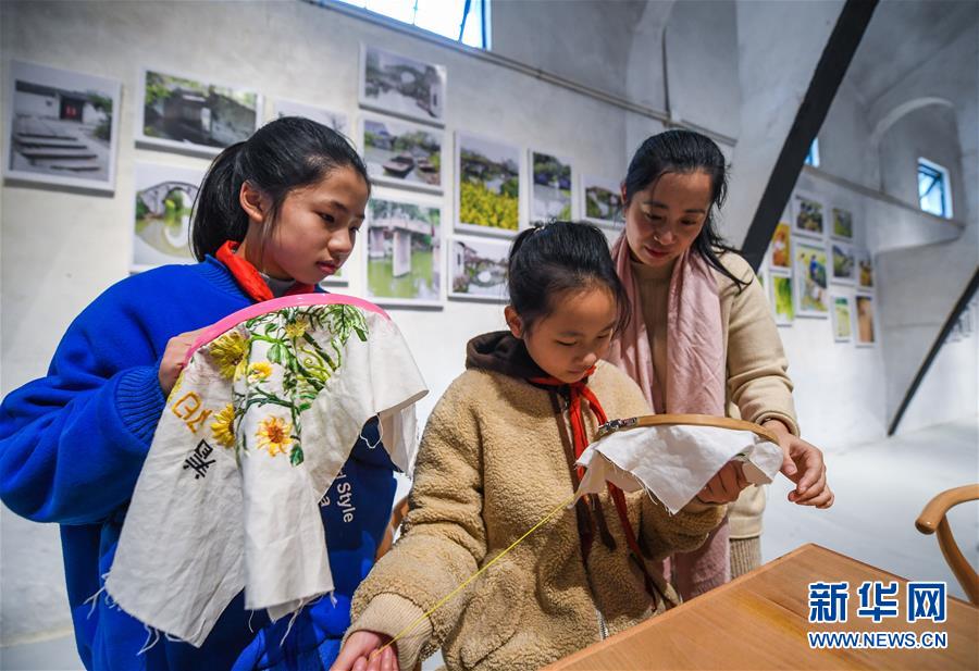 12月20日,學(xué)生在舊糧倉改建的“漾西書吧”內(nèi)學(xué)習(xí)傳統(tǒng)刺繡。 新華社記者 徐昱 攝