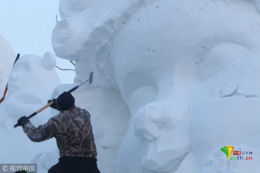 2018年12月13日,黑龍江省哈爾濱市,國內(nèi)最大的雪雕盛會太陽島雪博會正在緊鑼密鼓建設(shè)中,部分雪雕雛形已現(xiàn),雪雕師正在精雕細刻打磨中。