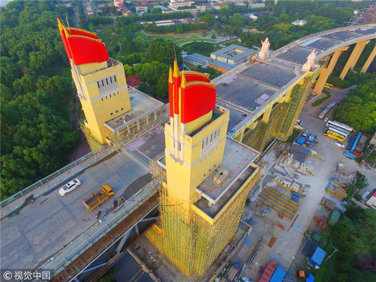 2018年6月24日,南京長江大橋修葺一新的米黃色橋頭堡,鮮艷的三面紅旗。