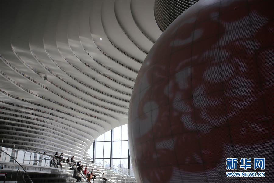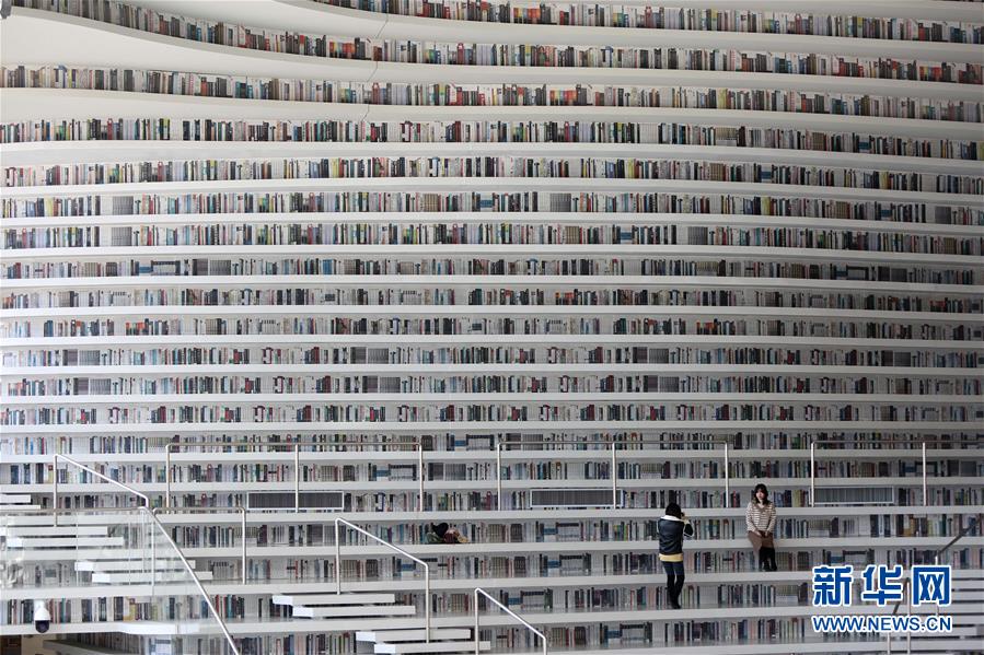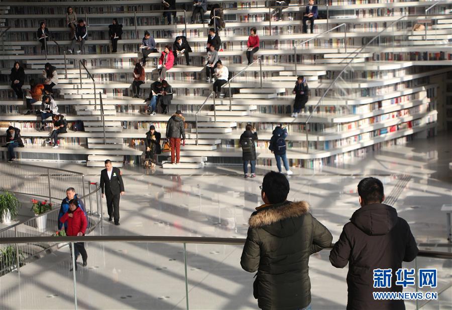 12月27日,讀者在天津?yàn)I海新區(qū)圖書館的“書山”上參觀。 濱海新區(qū)圖書館位于天津?yàn)I海文化中心,2017年10月1日正式開(kāi)館,設(shè)計(jì)立意為“濱海之眼”和“書山有路勤為徑”。圖書館現(xiàn)有藏書60多萬(wàn)冊(cè),一年多來(lái)接待讀者約280萬(wàn)人次,已成為濱海新區(qū)的文化“新地標(biāo)”。 新華社記者段卓力攝