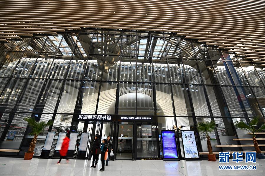 這是12月27日拍攝的天津?yàn)I海新區(qū)圖書館入口。 濱海新區(qū)圖書館位于天津?yàn)I海文化中心,2017年10月1日正式開(kāi)館,設(shè)計(jì)立意為“濱海之眼”和“書山有路勤為徑”。圖書館現(xiàn)有藏書60多萬(wàn)冊(cè),一年多來(lái)接待讀者約280萬(wàn)人次,已成為濱海新區(qū)的文化“新地標(biāo)”。 新華社記者李然攝