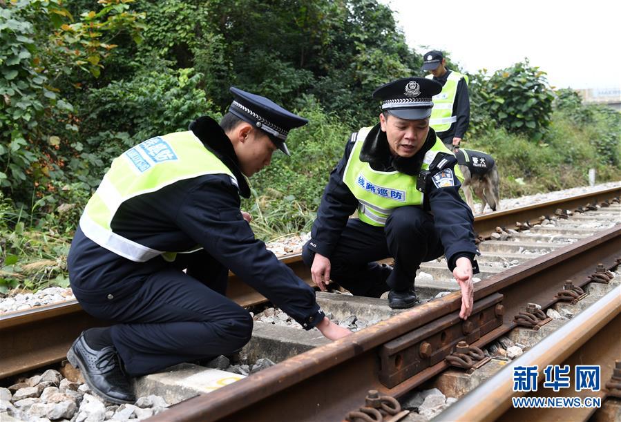 鐵路公安民警陸日峰(左二)和同事在中越邊境巡線時檢查鐵軌情況(2018年12月31日攝)。 新華社記者陸波岸攝