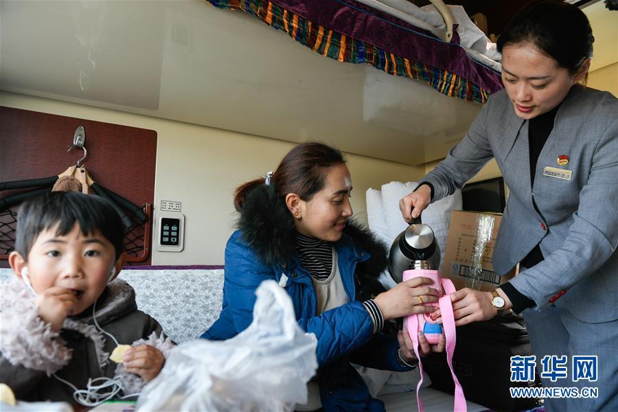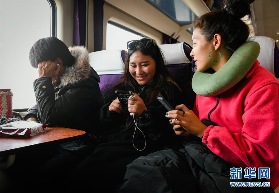 大學生剛措(右)和桑旦措姆(中)放寒假乘坐Z6802次列車回老家那曲(1月11日攝)。