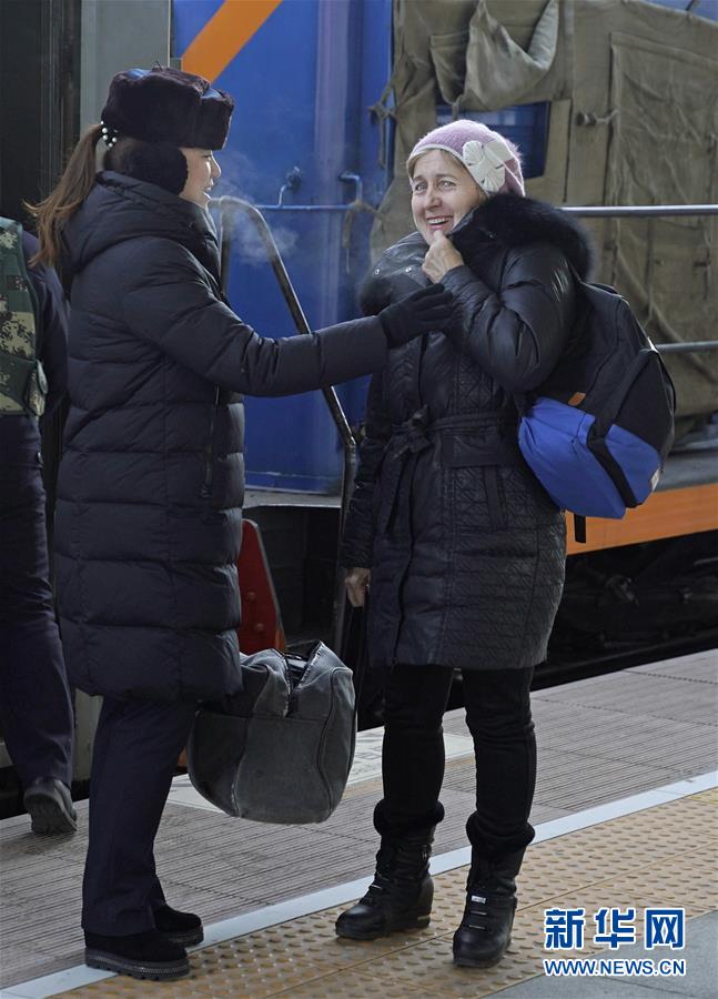 1月11日,在滿洲里火車站站臺(tái),“金鑰匙”服務(wù)臺(tái)客運(yùn)員協(xié)助外籍旅客乘車。