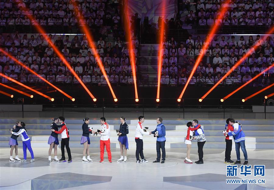 1月15日,中芬運(yùn)動(dòng)員代表互贈(zèng)紀(jì)念品。 當(dāng)日,“2019中芬冬季運(yùn)動(dòng)年”開幕式在北京首鋼冰球館舉行。 新華社記者申宏攝