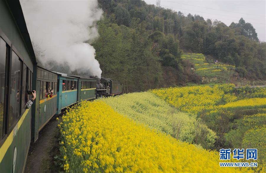 3月20日,一列嘉陽(yáng)小火車(chē)在油菜花叢中穿行。