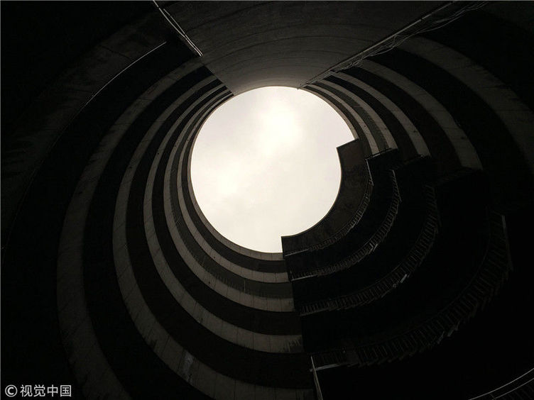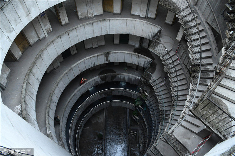 2018年12月6日,重慶江北紅旗河溝汽車(chē)站內(nèi),有一棟獨(dú)特的八層圓環(huán)狀建筑,底層每天有不少進(jìn)出站的客車(chē)通行。據(jù)悉,這棟樓建于1990年,曾經(jīng)是車(chē)站旅館,如今一、二兩層用于車(chē)站辦公,其余樓層已廢棄。為確保安全,三層以上已經(jīng)被封鎖。圖為公交車(chē)穿過(guò)8層空心圓筒樓。徐勇/視覺(jué)中國(guó)