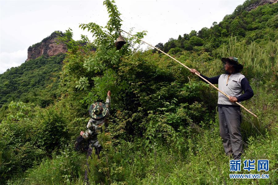 5月10日,在甘肅省隴南市徽縣大河店鎮(zhèn)硬灣村,蜂農(nóng)周仲頤(右)在收蜂。 甘肅省隴南市徽縣大河店鎮(zhèn)硬灣村位于秦巴山區(qū)深處,2017年,在當(dāng)?shù)卣姆龀窒?,龍崖老巢蜜養(yǎng)殖農(nóng)民專(zhuān)業(yè)合作社成立,蜂農(nóng)們將傳統(tǒng)養(yǎng)蜂技藝和現(xiàn)代加工方式相結(jié)合,并通過(guò)電商等渠道打開(kāi)銷(xiāo)路,有效帶動(dòng)了當(dāng)?shù)刎毨Т迕衩撠氈赂弧D壳罢麄€(gè)合作社共有蜂箱2000余個(gè),每箱每年可帶來(lái)三四千元的收入。 新華社記者 馬寧 攝