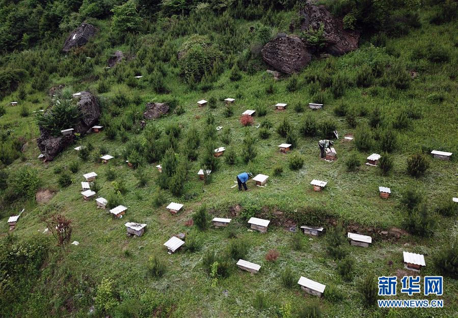 5月10日,在甘肅省隴南市徽縣大河店鎮(zhèn)硬灣村,蜂農(nóng)查看蜂箱情況(無人機拍攝)。 甘肅省隴南市徽縣大河店鎮(zhèn)硬灣村位于秦巴山區(qū)深處,2017年,在當?shù)卣姆龀窒?,龍崖老巢蜜養(yǎng)殖農(nóng)民專業(yè)合作社成立,蜂農(nóng)們將傳統(tǒng)養(yǎng)蜂技藝和現(xiàn)代加工方式相結(jié)合,并通過電商等渠道打開銷路,有效帶動了當?shù)刎毨Т迕衩撠氈赂?。目前整個合作社共有蜂箱2000余個,每箱每年可帶來三四千元的收入。 新華社記者 馬寧 攝