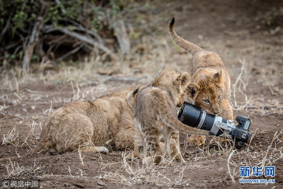 近日,非洲博茨瓦納馬沙圖野生動物保護區(qū)內(nèi)一頭獅子叼起攝影師掉落在地上的相機,之后還將相機交給小獅子們玩耍,看起來十分好奇,而攝影師非常無奈。現(xiàn)年57歲的叢林探險家Barbara Jensen Vorster在一輛越野車上為馬沙圖野生動物保護區(qū)的獅群拍照時,相機不小心掉到了地上。砰的一聲響驚動了母獅子,它向攝影師方向移動,迫使探險隊撤退。(圖片來源:視覺中國)
