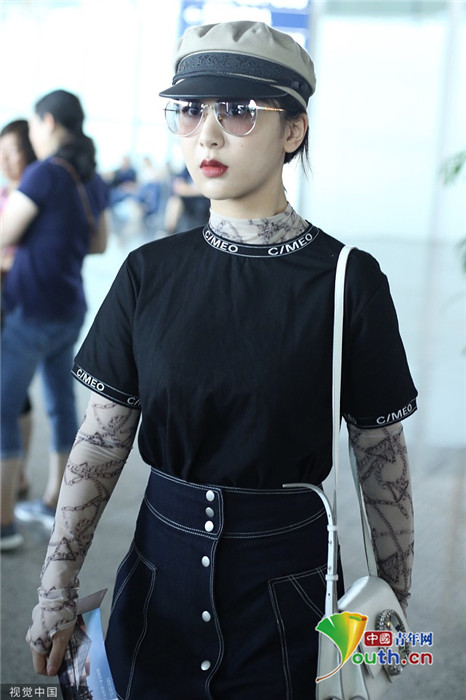2019年7月25日,北京,楊紫現(xiàn)身機(jī)場(chǎng)。她穿黑色短T配牛仔裙變時(shí)髦女郎,戴報(bào)童帽架墨鏡”港風(fēng)女sir“即視感,人氣爆棚。