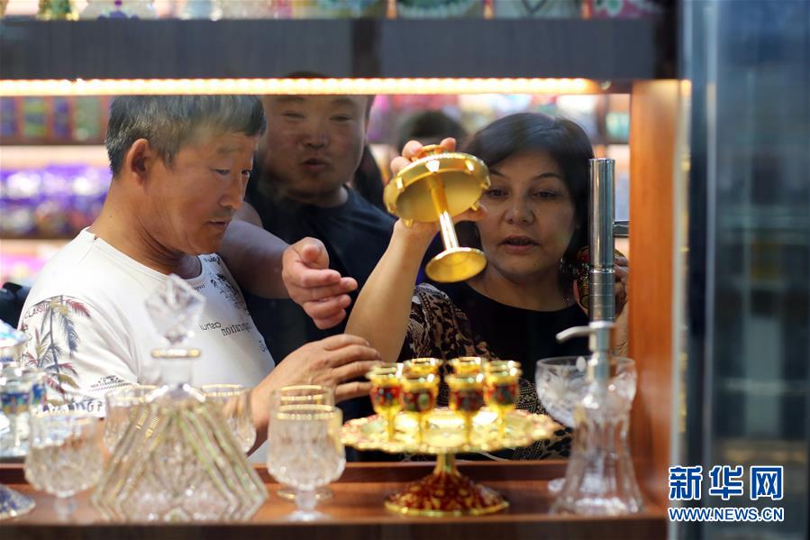 9月4日,在新疆塔城地區(qū)巴克圖口岸,顧客在絲路文化商品城內(nèi)選購(gòu)商品。 新華社記者程麗攝