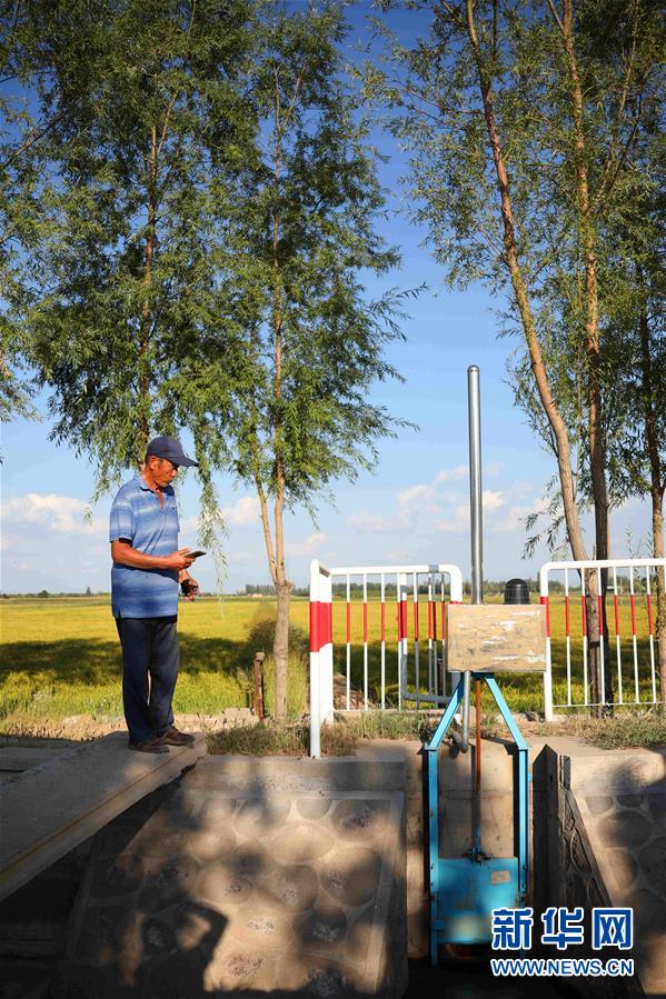 銀川市賀蘭縣常信鄉(xiāng)潭渠村村民用水協(xié)會會長孫萬銀輕點手機,灌溉支渠上的水閘緩緩升起(9月1日攝)。新華社記者劉詩平攝
