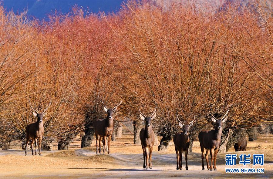 馬鹿棲息在位于雅魯藏布江岸邊的山南市乃東區(qū)澤當(dāng)鎮(zhèn)的萬畝人工防護林里(2018年1月6日攝)。新華社記者 張汝鋒 攝