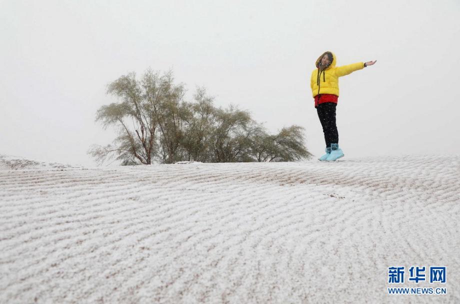 10月15日,游客在寧夏中衛(wèi)市沙坡頭景區(qū)欣賞沙漠雪景。新華網(wǎng)杜文杰攝