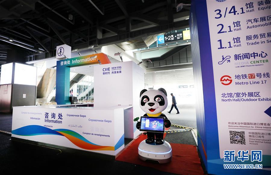 10月25日,位于國展中心內(nèi)的國家會(huì)議中心入口處張貼了醒目的進(jìn)博會(huì)吉祥物熊貓進(jìn)寶裝飾。 新華社記者 方喆攝