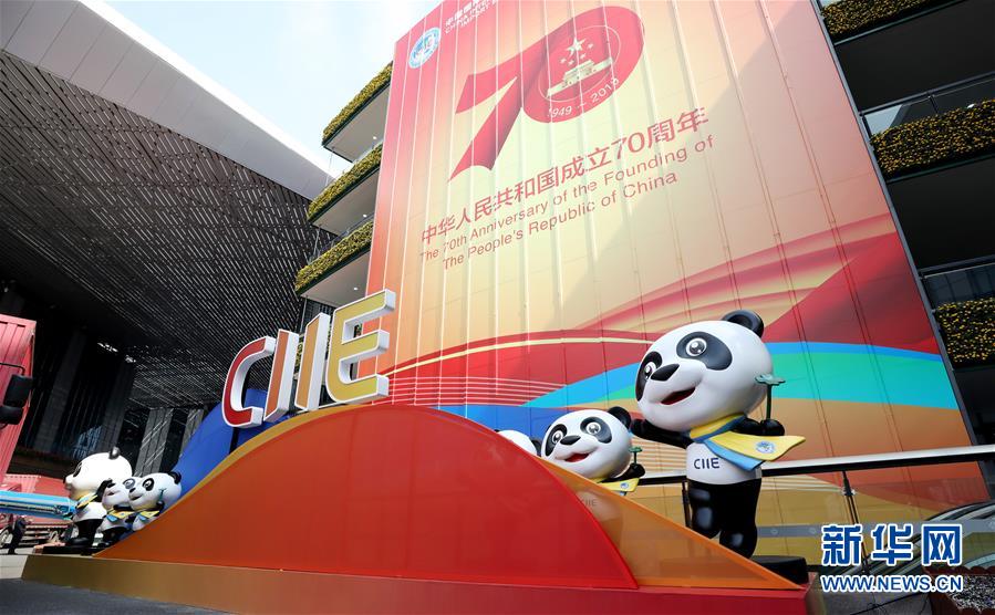 10月25日,國家會展中心(上海)內(nèi)慶祝國慶的裝飾前擺放了進(jìn)博會標(biāo)識和吉祥物熊貓進(jìn)寶。 新華社記者 方喆攝