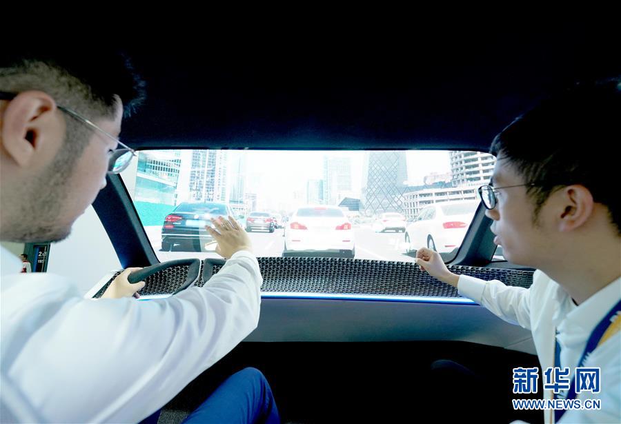 11月5日,技術(shù)工程人員(右)在第二屆進(jìn)博會(huì)汽車(chē)展區(qū)寶馬展臺(tái)“超界面”沉浸式數(shù)字體驗(yàn)倉(cāng)內(nèi)向參觀者介紹。新華社記者陳建力攝