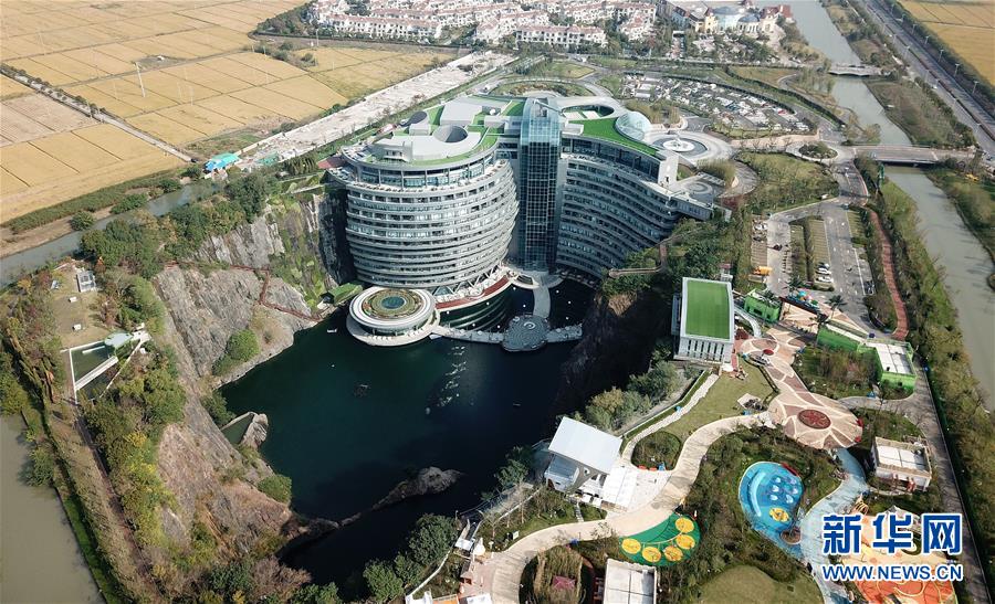 這是位于上海松江佘山腳下的世茂洲際酒店(11月13日無人機(jī)拍攝)。位于上海松江的世茂洲際酒店11月15日正式開門營業(yè)。這家在一個廢棄采石礦坑內(nèi)建成的酒店成為上海又一新景。新華社記者方喆攝