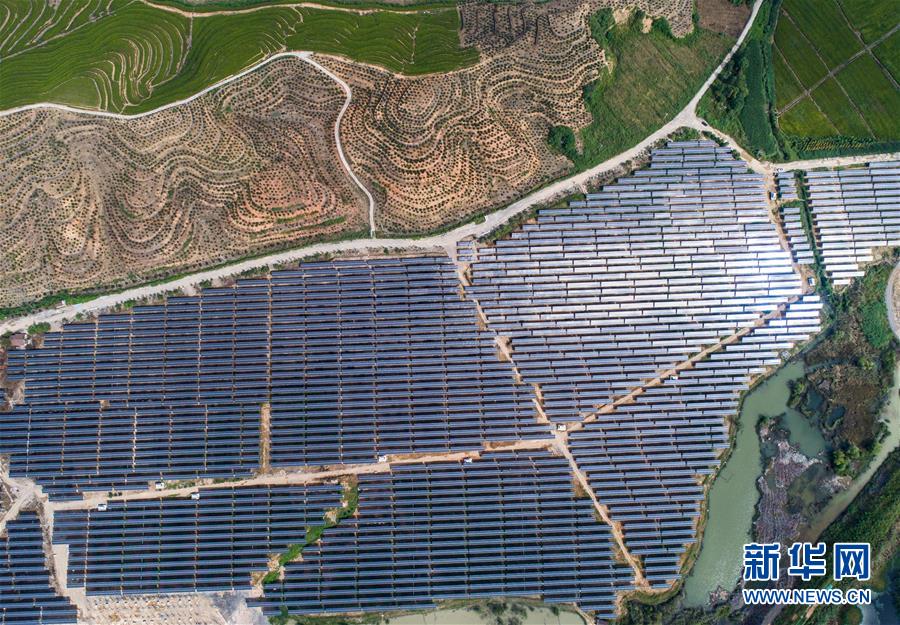 空中俯瞰湖州市埭溪鎮(zhèn)東紅村的光伏發(fā)電站(9月26日無人機拍攝)。該光伏電站占地2500多畝,是當地廢棄礦坑通過改造建成的“農光互補”光伏發(fā)電站。