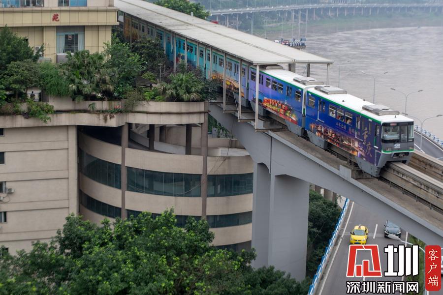 2019年6月25日,重慶渝中區(qū),軌道交通2號(hào)線列車從一小區(qū)的6層“螺旋”停車場上方穿過,顯得十分“魔幻”。圖為高處拍攝的軌道交通2號(hào)線。