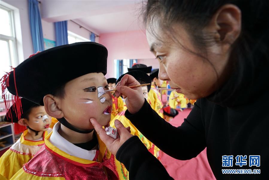 12月19日,河北省灤州市小閆營小學(xué)教師在為排練地秧歌的學(xué)生化妝。新華社記者 牟宇 攝
