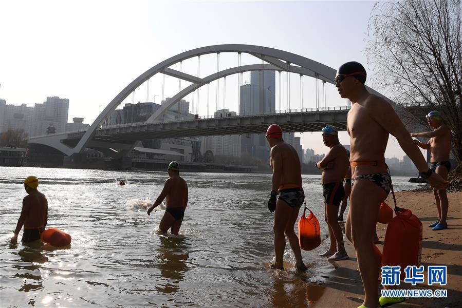 12月19日,在蘭州市馬拉松文化主題公園附近的黃河岸邊,冬泳愛好者入水準備冬泳。新華社記者馬寧攝